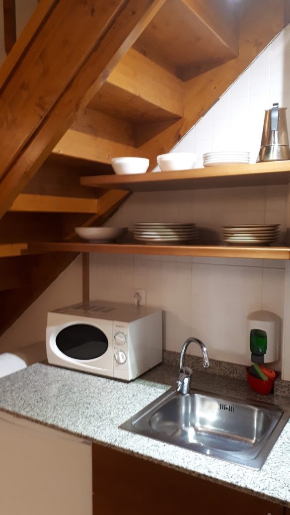 La habitación es un apartamento dúplex. En la parte inferior está la cocina, muy completa, con nevera, microondas y muchos utensilios de cocina (platos, vasos, tazas, ollas, sartenes, etc…), una mesa con sillas para poder comer y, al fondo, un sofá-cama y la televisión.